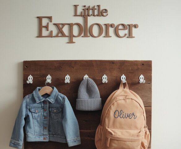 One of the cutest ways to keep your baby boy’s nursery organized is by adding pegboards or wall hooks. In the image, you can see a simple yet charming setup featuring a wooden board with hooks. It’s a practical space-saving solution that keeps tiny jackets and hats neatly displayed.