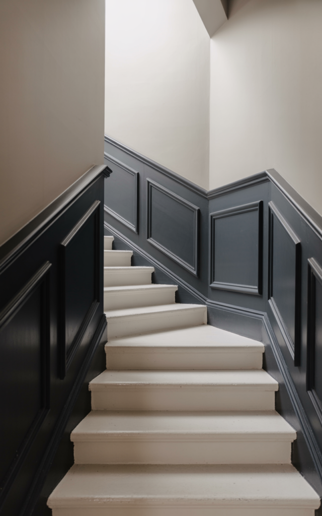 Install black wainscoting on the lower half of the stair wall. Keep the top half white. The darker lower section hides scuffs — especially in high-traffic homes.
