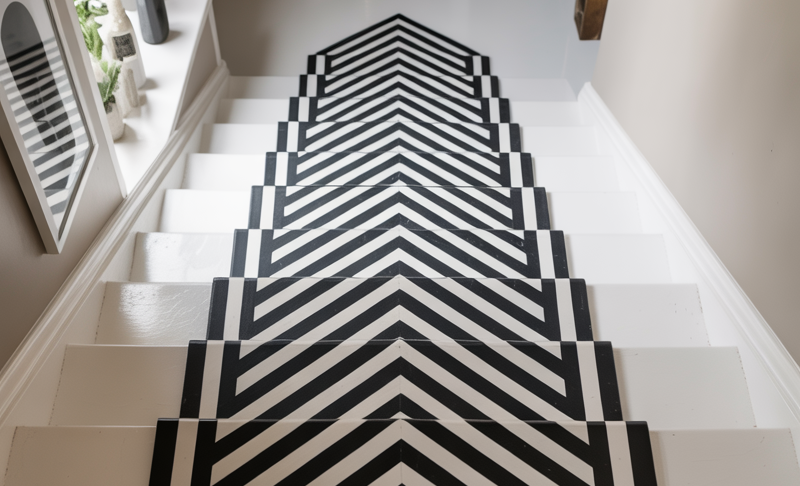 Choose a bold geometric or stripe pattern in black and white. It brings movement to the staircase. Suddenly, your stairs aren’t just functional — they’re a focal point.