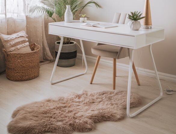 When you lay down a faux fur rug, it not only feels great underfoot but also creates a cozy atmosphere. It’s like having a little piece of comfort right where you work. You can choose colors that complement your decor, like the soft beige in the image, which blends seamlessly with the light tones of the room.