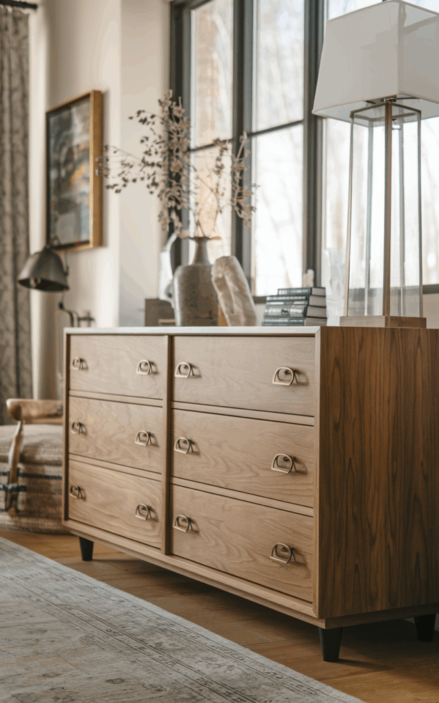 Swap dresser knobs and drawer pulls for warmer finishes. Brushed brass. Matte black. Antique bronze.