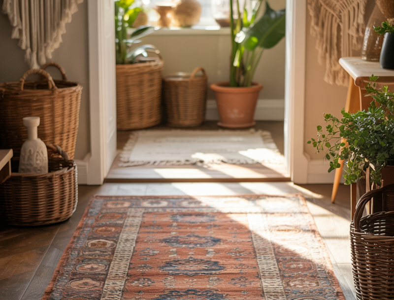A patterned runner or textured rug adds warmth instantly. It also defines the space—even if your entrance blends into your living room.