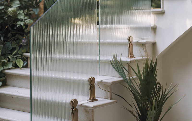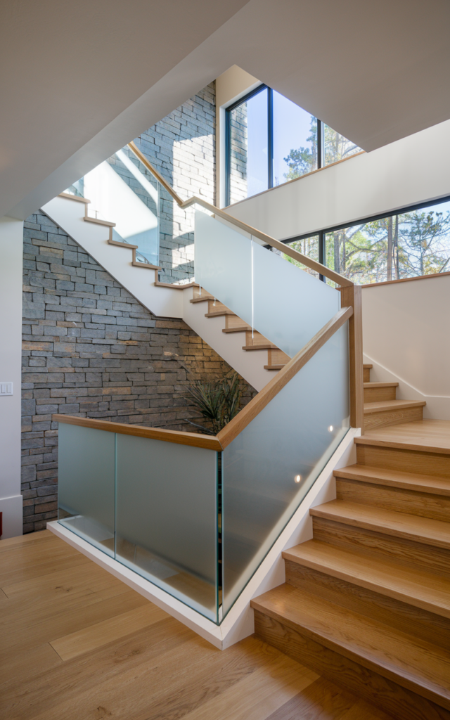 Stringers — the side supports of the stairs — can frame the glass beautifully.
