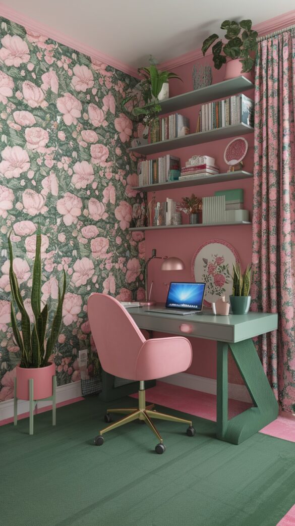 A bold pattern can be a game changer in your office decor ideas. It’s like giving your walls a makeover they never knew they needed. The pinks and greens in this design create a gorgeous contrast that feels fresh and inviting. Plus, it perfectly highlights your beautiful desk setup!