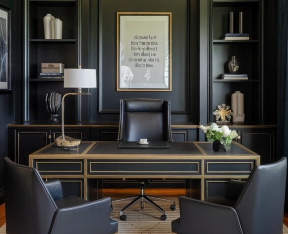 When I think about a masculine home office, built-in cabinetry in rich black or warm walnut comes to mind instantly. These finishes not only look sharp but also add a touch of sophistication to any workspace.