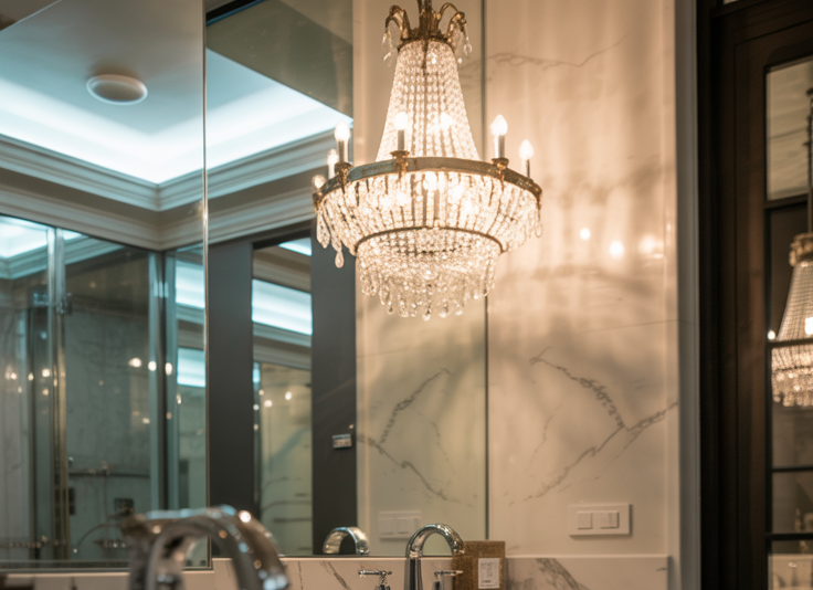 The soft lighting from a chandelier feels warm and flattering. It sets the mood and makes the bathroom feel more like a relaxing retreat. It adds charm and sophistication.