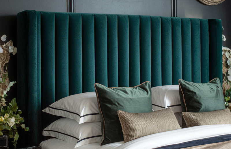 Introduce a statement headboard in a rich fabric.