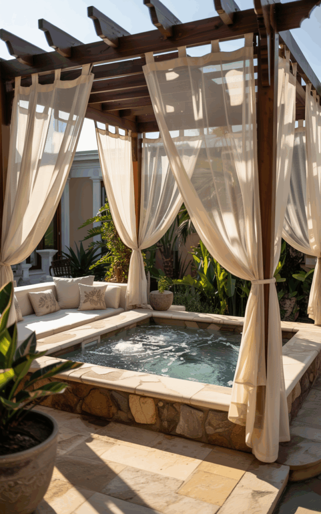 Add a pergola curtain system for a resort-style outdoor jacuzzi