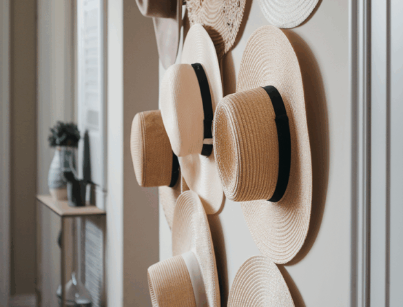 Hooks on the hallway wall turn your collection into an art installation. The textures of the straw or felt add warmth to the walls.