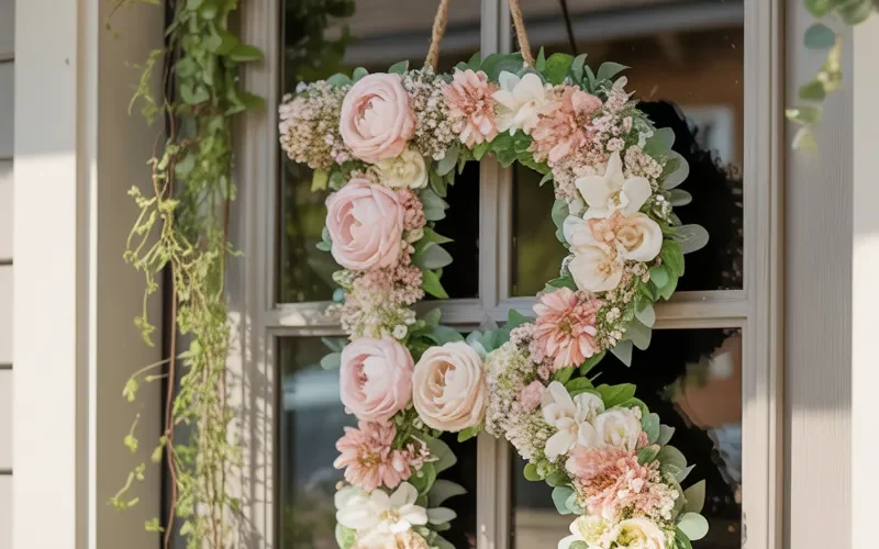 A full floral wreath instantly tells everyone spring has arrived. I personally love faux tulips, eucalyptus, lavender, and soft peonies because they stay fresh-looking all season long.