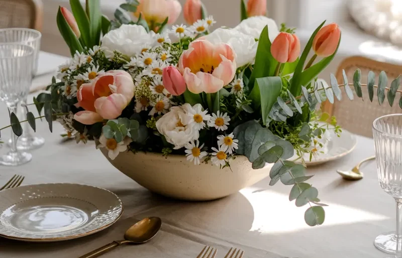 Instead of a formal bouquet, create a loose garden-style centerpiece with tulips, daisies, peonies, and eucalyptus. Let some stems fall naturally outward.