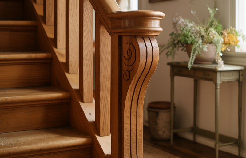 Install small wooden brackets beneath the handrail for a crafted look. They don’t overwhelm. They enhance.