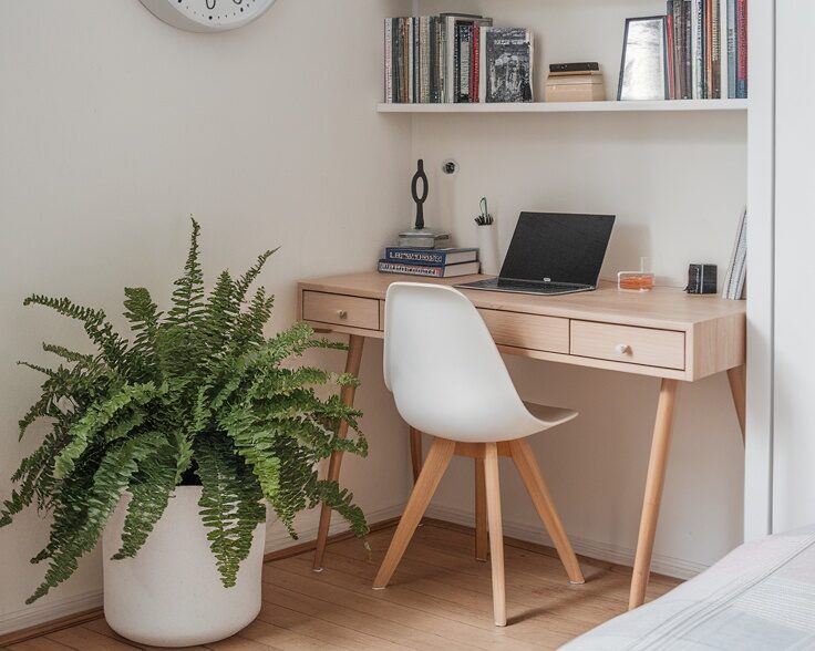 A simple wooden desk complements the bookshelf perfectly. It’s not cluttered, yet it holds essential items like a laptop and some books. The chair, with its classic design, invites you to sit and get to work, or maybe just dream for a bit. There’s a potted plant by the desk, bringing a hint of nature indoors.